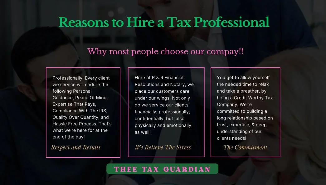 We are committed to building long lasting relationships based on Respect and Results. We take pride in helping our clients from all avenues of life, achieve the Financial Resolutions and Peace they deserve during Tax Season!